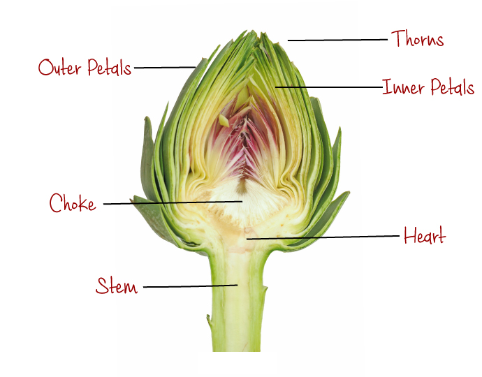 The artichoke is made up of the outer petal, Ā the inner petals, the center choke, the heart and the stem.